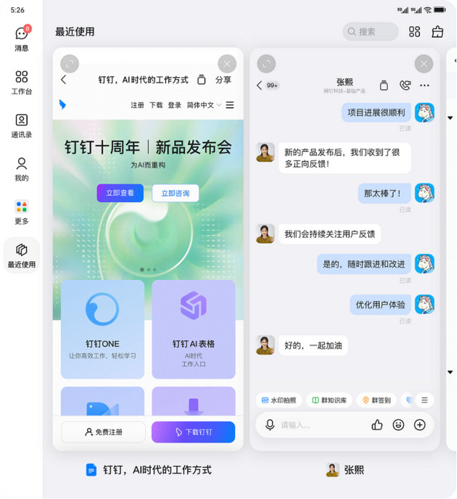 对于折叠屏用户,钉钉的“自由多任务”功能可谓福音。一边开视频会议,一边在旁边窗口查阅资料或记录纪要,大屏优势被彻底释放。多设备协同也让工作流更灵活——手机上没看完的文档,平板上接着处理,进度实时同步。