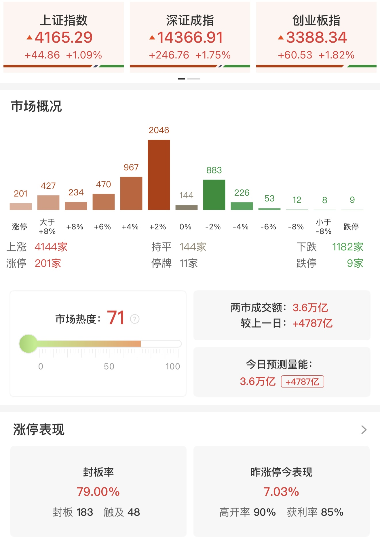 财联社1月12日电 市场震荡拉升,三大指数均涨超1%,创业板指探底回升,此前一度跌超1%。沪深两市成交额3.6万亿,连续第2个交易日突破3万亿,较上一个交易日放量4787亿,刷新此前在2024年10月8日创下的成交额历史纪录。盘面上,市场热点轮番活跃,全市场超4100只个股上涨,其中201只个股涨停。