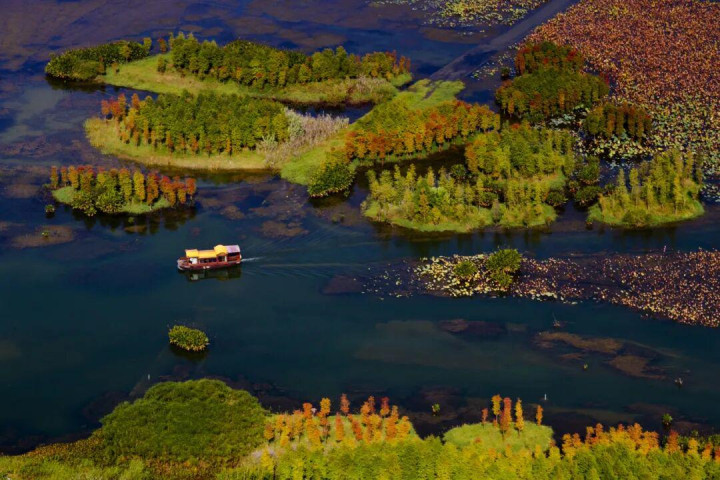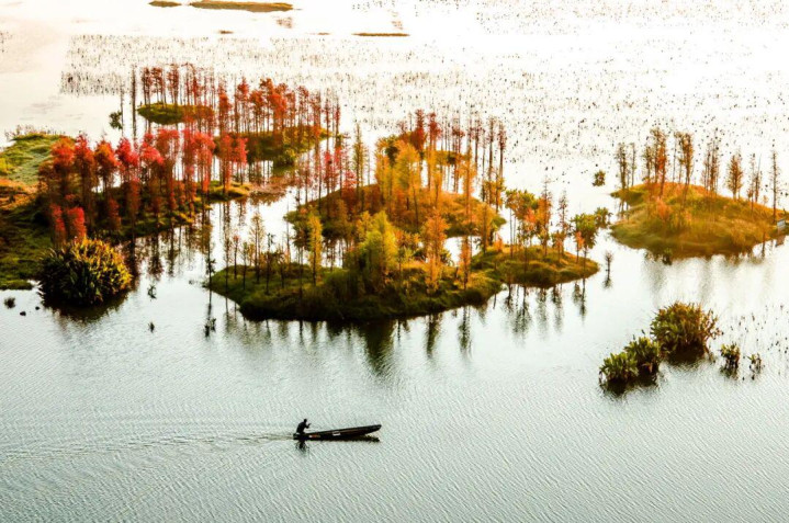 周围被誉为“植物活化石”的水杉依水而生,或成排挺立,或聚丛生长。春夏时节,满目苍翠,倒映碧波;秋冬之际,树冠渐染金辉,与湖光山色相映成趣。