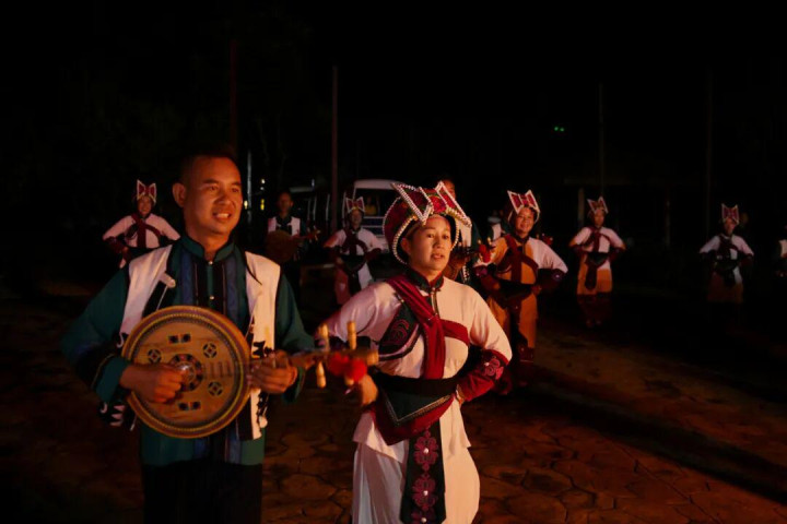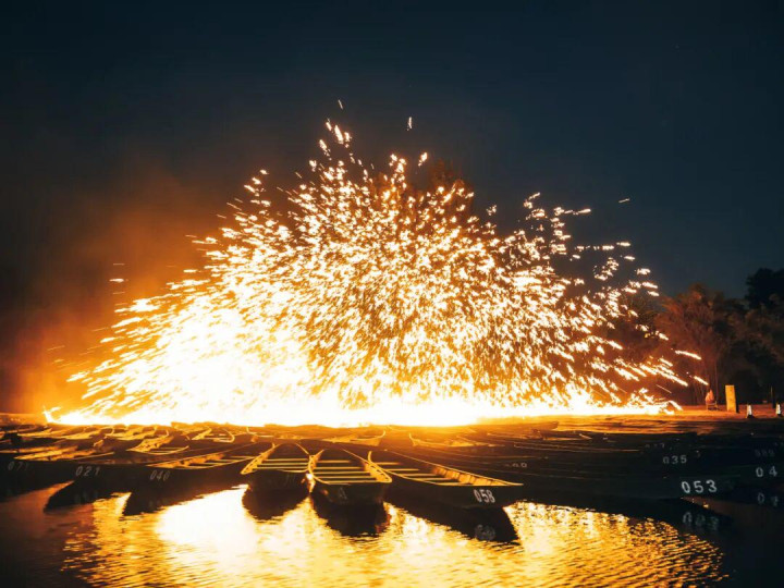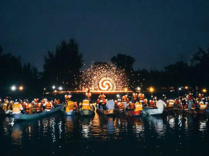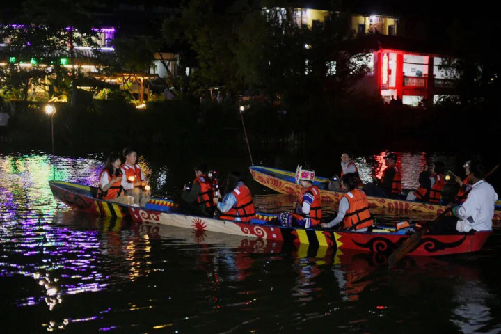 普者黑夜游(水上夜游+文化体验):渔火轻舟,穿越彝家灯火,星河倒影,铁水绽放银花,篝火映红神秘花脸图腾,踏歌起舞坠入狂欢秘境。夜幕降临,霓虹灯交织成光与影的海洋,夜色中独具特色的民族建筑、街巷与山水田园风光融为一体,感受生活最原始、最本真的样子。