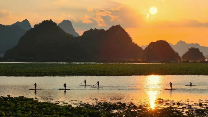 普者黑东线(乘柳叶小舟):赏水上田园、游彝家水乡,夏日激情水仗、秋冬宁静自愈。随小舟荡漾于清澈透明的湖面,来一场心无旁骛、酣畅淋漓的激情打水仗,舟随景移炊烟袅袅的村庄,远处的孤峰,近处的碧波,汇聚成一幅独一无二的喀斯特山水田园风光。