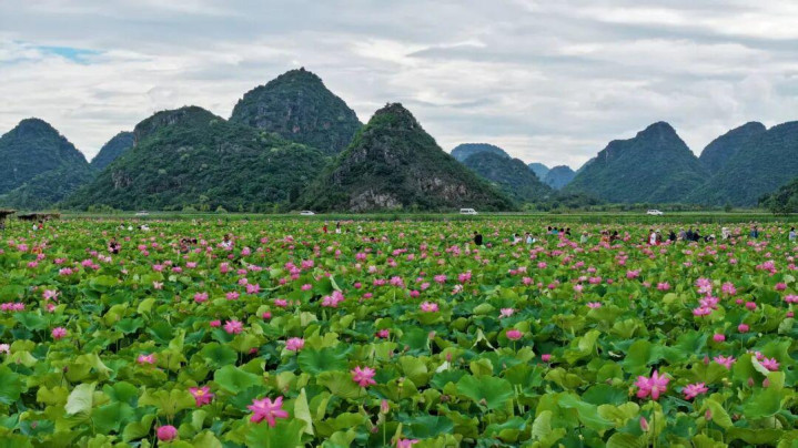 在普者黑21千米长的游线上,生长着270余种世界知名的荷花,荷花绵延几十里,总面积达数4万余亩,著名的有普者黑白莲、红莲、大洒锦、小洒锦、并蒂莲,小洒锦白花镶红边,大洒锦花瓣一半红一半白,并蒂莲一朵荷杆上开出两朵荷花。同时培育睡莲系列科罗拉多、万维莎、墨西哥黄睡莲、佛罗蒂亚、白天鹅等100余种:荷系列国庆红、大足红莲、太空飞天等300余种,花期到来,将与野生荷花相互映衬,形成一幅绚丽多彩的水上花海画卷。