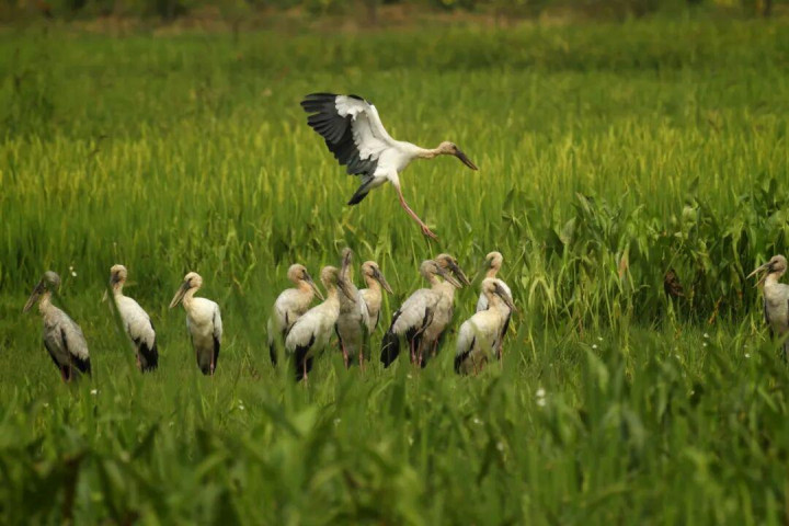 普者黑喀斯特湿地属珠江流域西江水系上游,生态系统极具典型性,良好的生态环境孕育了极其丰富的生物多样性。208种鸟类在此栖息,金雕和东方白鹳2种国家Ⅰ级保护鸟类翱翔天际,20种国家Ⅱ级保护鸟类穿梭林间;除此之外常见的鸟类还有斑嘴鸭、紫水鸡、白鹭、白骨顶、苍鹭、钳嘴鹳、斑头雁等。徜徉于湖区之中,不仅能观赏到“湖光山色,碧水连天,万鸟齐飞,对对双飞”的景象,还能领略“鸟在天上飞,人在画中游”的意境。