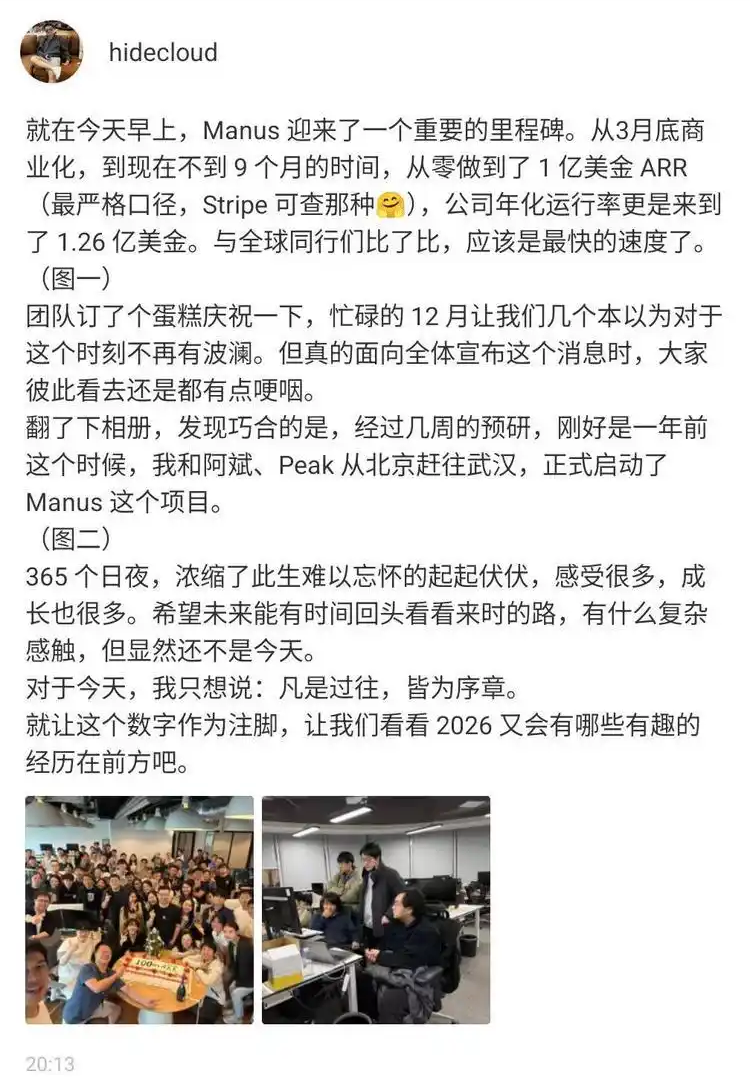 2025年12月17日晚,Manus联合创始人hidecloud发布的一条动态