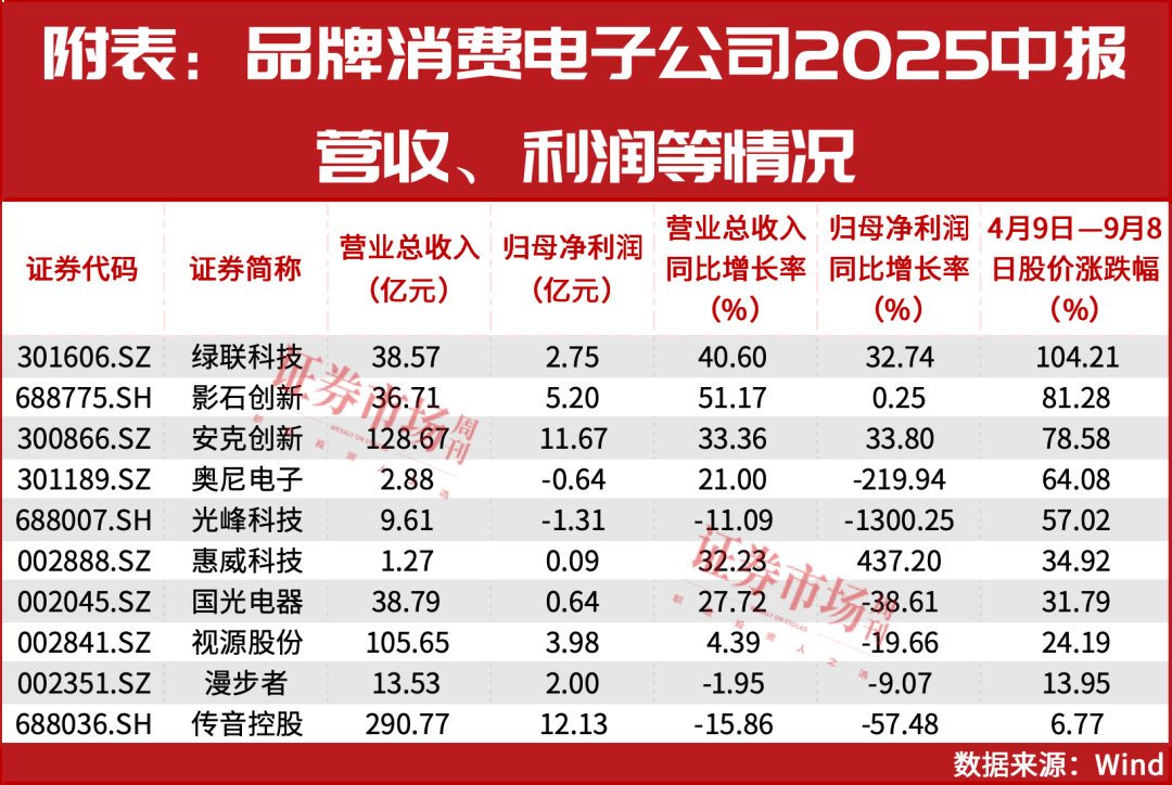 受需求和成本等因素影响,品牌消费电子今年上半年业绩表现不佳,但股价普遍表现良好,其背后或是行业基本面正在企稳向上。