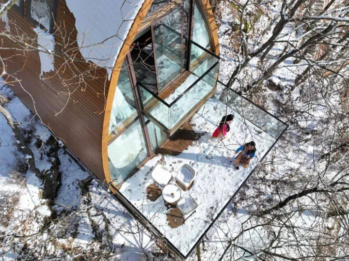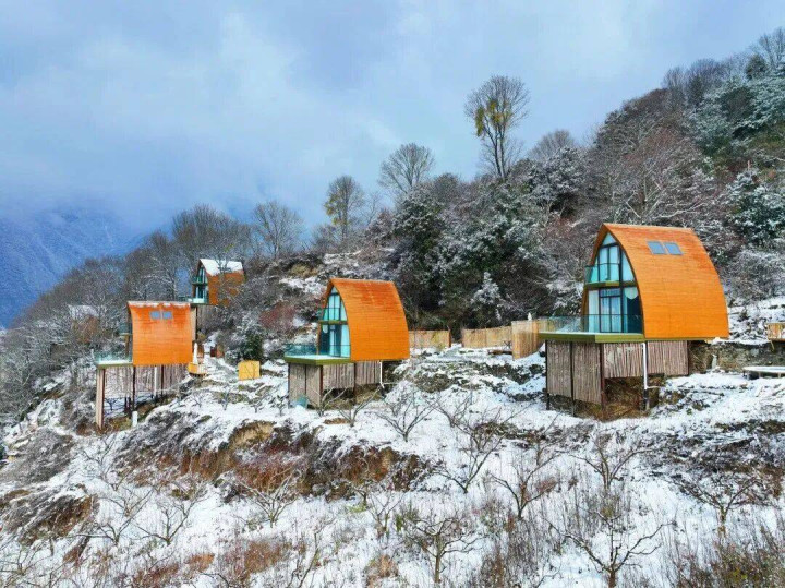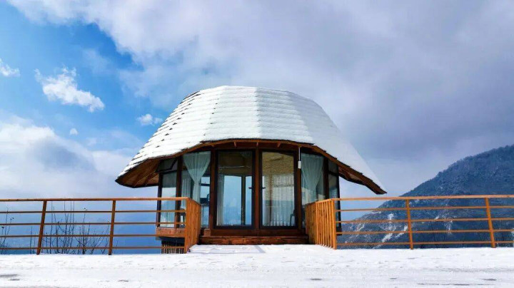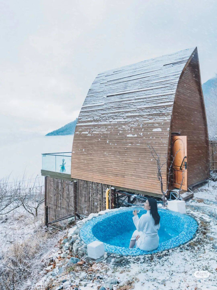 坐落在雪山脚下的归隐·野奢私汤民宿,6栋森林树屋与1座合院错落有致,屋顶和院子积着厚厚的雪,像闯进圣诞老人的秘密基地。