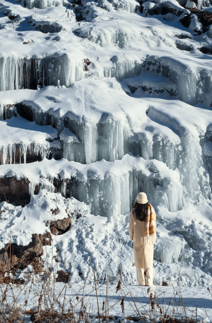 穿一件红色外套站在冰瀑前,红与白的碰撞格外夺目,随手一拍,都能在朋友圈C位出道~