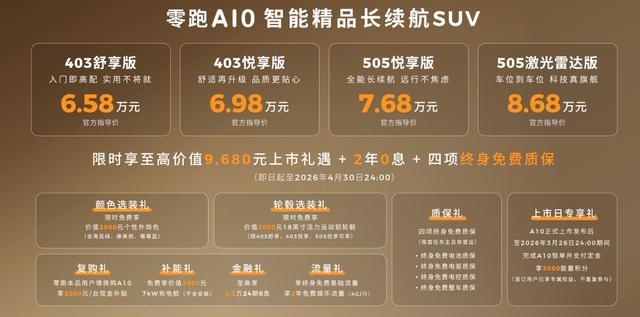 务实,这是零跑品牌给很多人的第一印象。虽然是一家成立时间不长的车企,但从成立之初,零跑就坚持核心技术自研自产,这也是其可以在价格、产品力等方面保持优势的重要原因。对刚刚上市的零跑A10,虽然其定位是小型SUV且在纯电续航里程方面更有优势,但6.58-8.68万元的官方售价,让其将对手锁定在吉利星愿、比亚迪海鸥等纯电小型车上,价格相当的情况下,动力更强、续航更长、空间也占优,这是零跑A10打动消费者的地方。2025年,吉利星愿的年销量超过45万元,硬件条件更优的零跑A10,实现年销20万辆或是可以期待的,理由是起步价格12.28万元的零跑C10,其月均销量都可以超过1万辆,这说明零跑已经在国内新能源市场获得了消费者的认可度。