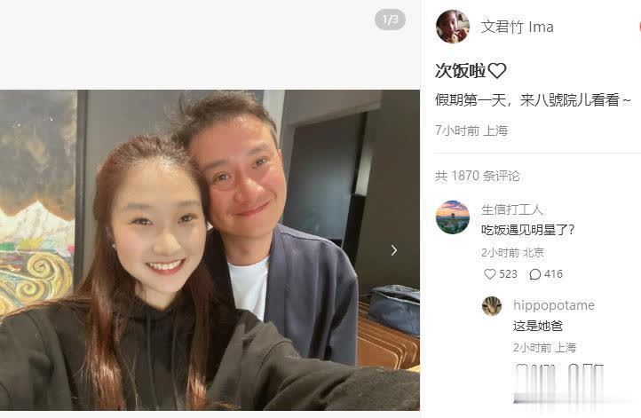 4月4日,清明假期第一天,文章的大女儿文君竹在社交账号上晒出一组和爸爸聚餐的照片,地点选在了北京一家叫“八号院儿”的陕西风味餐厅。父女俩头贴头靠在一起,笑容灿烂,温馨得不得了。