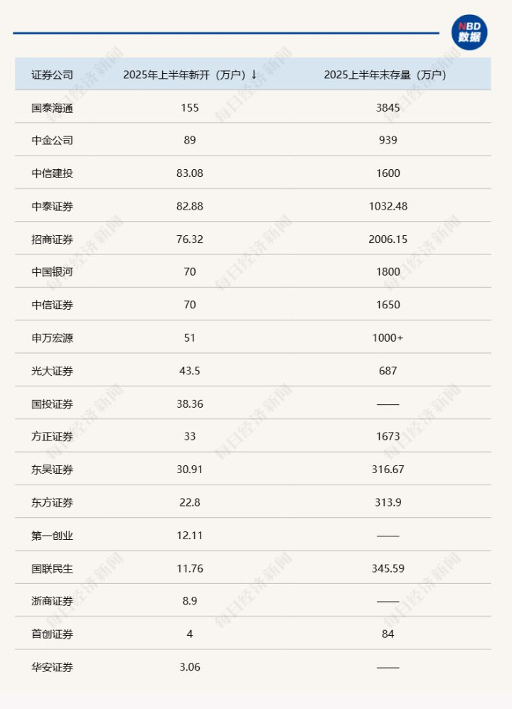 从新增开户情况来看,头部券商的领先地位十分明显。《每日经济新闻》记者梳理各家券商2025年半年报发现,国泰海通受益于并表效应,在客户总数去重口径下仍实现显著增长,新增客户约155万户;中金公司、中信建投和中泰证券的新增开户数均超过80万户;招商证券、中信证券、中国银河的新增开户数突破70万户;申万宏源证券新增开户数也超过50万户。